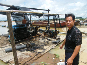 昨天上午11時(shí)許,記者與梁先生一同到現(xiàn)場(chǎng)了解情況。梁先生的金江沙場(chǎng)位于定安定城鎮(zhèn)和海口新坡鎮(zhèn)交界處,已經(jīng)暫停作業(yè),工人們?cè)诠づ镄菹ⅰS浾咴诓缮炒粴КF(xiàn)場(chǎng)看到,采沙船擱淺在岸邊,采沙機(jī)器完全被毀,電池?zé)梗景迩Н彴倏祝砻姹淮蠡鹧脼鹾冢瑑?nèi)部零件完全破壞。雖然距離案發(fā)已有10余天,當(dāng)時(shí)大火熊熊燃燒的情景依然可以想見。