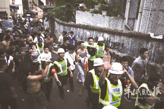 昨日下午2時,羊城晚報記者接到報料迅速趕往現場見到,圍觀的人群布滿在各個警戒線的周圍,現場停了十幾輛警車和消防車,數十名警察和消防人員聚集在樓下商量對策。