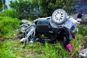 昨日凌晨,四川閬中市巴都大道發(fā)生一起車禍,一輛小轎車越過37米寬的稻田飛上二樓,將居民住房撞了一個直徑約1米的大窟窿。據(jù)圍觀的士司機介紹,小轎車能飛越37米寬的稻田,時速至少在每小時180至200公里以上。