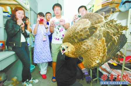9月28日傍晚 6時許 ,青島大學(xué)美術(shù)學(xué)院的女生小劉下課后回到宿舍,剛走進宿舍門,一只鷹從陽臺飛進屋內(nèi)朝她撲來,嚇得她失聲尖叫沖到門外。這只鷹在屋內(nèi)東闖西撞,墻壁上留下了斑斑血跡,隨后趕來的男生將它抓住。29日下午,青島市動物園動物管理科的專家來到宿舍將受傷的鷹帶走,經(jīng)鑒定這只鷹是國家二級保護動物——蒼鷹,工作人員將會在其傷情痊愈后擇日放生。