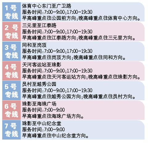 從今天起,(廣州)市民搭乘公交地鐵不再免費,相關交通補貼該如何發放,政府相關部門正在研究制定,以確保符合條件的每個家庭和個人都能享受到。記者昨天從廣州市交委獲悉,為進一步方便市民出行,從今天起,交通部門將在上下班高峰期增開7條公交專線,分別與地鐵一號線、二號線、三號線、五號線、八號線等一些客流量集中的地鐵線網區段平行走向。