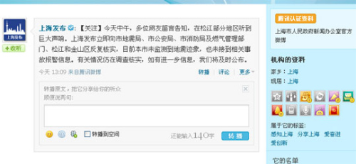 記者從上海市政府新聞辦公室官方微博“上海發(fā)布”獲悉,今天中午,有網友留言告知,在松江部分地區(qū)聽到巨大聲響。上海發(fā)布立即向市地震局、市公安局、市消防局及燃氣管理部門、松江和金山區(qū)反復核實,目前本市未監(jiān)測到地震跡象,也未接到相關事故報警信息。有關情況仍在調查核實,如有進一步信息,將及時公布。(記者 劉軍濤)