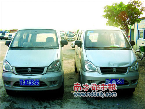 昨天下午4點鐘,羅湖交警大隊西嶺下扣車場,丁先生的車和套牌車停在一角。“這簡直就是孿生的嘛”,一位車場工作人員這樣說,兩輛車同為哈飛面包車,車型完全相同,顏色同為銀灰色。