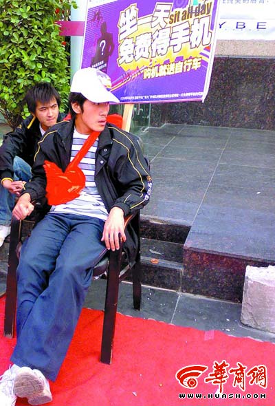 兩位 “靜坐者”的這一行為不時引來路人的注意和評論。兩人在“坐等”免費手機的同時,也成為了商家的活宣傳廣告。(記者 寧峰攝影報道)
