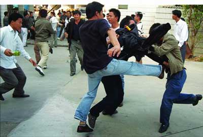 5分鐘后,校方員工再次出動,有的人手上還拿著兩根一米長的鐵棍,而工人們順勢從門口的竹籬笆處拔下七八根碗口粗的毛竹對鐵棍,雙方開始一場混戰,“啪、啪”聲不絕于耳。兩三分鐘后,毛竹被打爛,就在工人高喊著找磚頭時,警方趕到。一名警察一邊高喊“不許打架”,一邊拿著手中的辣椒噴霧器對著打斗雙方噴射……