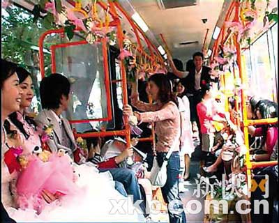 “一開始打算用寶馬當花車,但如果只租三四輛寶馬就不夠氣勢了,租七八輛又太貴,所以最后決定用一部超長的車來當花車,這樣既有氣勢又可省錢。”賴先生告訴記者,他把地面上能用的交通工具都想了個遍,后來經(jīng)過自家門口的同德圍車站時,突然發(fā)現(xiàn)215路公交車既長又寬,完全符合他的設(shè)想,因此定下來由它做花車。“這樣我和新娘,還有一幫朋友都可以聚在車里玩,好像舉辦一個結(jié)婚PAR-TY,很過癮。”賴先生說。