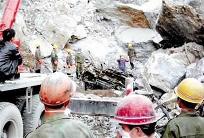 昨日凌晨4時(shí),搜救人員發(fā)現(xiàn)了最不愿意看到的結(jié)果:該客車被崩塌現(xiàn)場的巨石所掩埋。