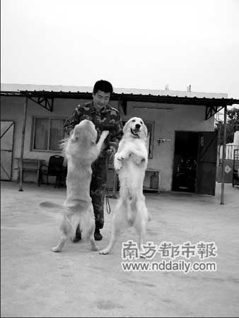 接著,在楊先生的指揮下,一條100多斤的臺灣高山狗“老虎”被牽出,在記者面前表演起握手、站立等技巧。拉布拉多獵犬“LUCK”則乖巧地表演起站立、跳圈、轉圈等絕技。兩條黃金獵犬因為在訓練師面前“爭風吃醋”,競相撲到訓練師身邊,做出站立、跳躍等動作吸引訓練師的注意,逗得眾人哈哈大笑。