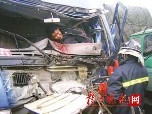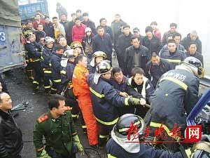 情況緊急,交警迅速調(diào)來清障車,將前面一輛卡車吊離;在騰出足夠的空間后,消防隊(duì)員馬上用機(jī)動(dòng)鏈鋸,在變形的車頭上鋸開一道口子,再用擴(kuò)張器進(jìn)行擴(kuò)張。但由于車頭變形嚴(yán)重,擴(kuò)張器“使不上勁”,破拆進(jìn)行得異常緩慢,而此時(shí)受困司機(jī)的呻吟越來越微弱。“不如系上繩子將鋼板拉翻”,現(xiàn)場(chǎng)一位群眾建議。消防隊(duì)員忙找來纜繩,纜繩的一頭拴在卡住司機(jī)身體的鋼板上,另一頭剛垂了下來,很多現(xiàn)場(chǎng)的群眾就趕忙走上前來和十多名消防隊(duì)員一起抓住了繩子,一齊使勁后鋼板卻沒有絲毫松動(dòng)。力量不夠!見此情景,旁觀的其他群眾馬上也加入到了拉繩子的行列中來,很多群眾都光著手死死地拽著鋼繩,“一、二、三”,壓在司機(jī)身上的鋼板終于被掀翻,司機(jī)得救了,現(xiàn)場(chǎng)一片歡呼聲。但躺在駕駛位后面的另一位男子已不治身亡。受傷司機(jī)介紹,事發(fā)時(shí),當(dāng)?shù)赝蝗怀霈F(xiàn)了濃霧,視線受阻,前方卡車突然剎車后,他就一頭撞了上去。 (水梅 路遙 宏偉 王國(guó)柱)