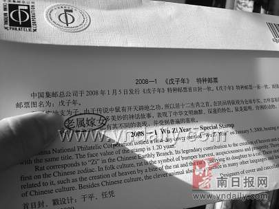 記者隨后來到楚雄集郵經(jīng)營部,花了2.2元也購買了一枚《戊子年》特種郵票首日封。該套首日封編號為2008-1,印量30萬枚,封上還加貼了中國集郵總公司的防偽標簽。當記者向工作人員詢問首日封文字中出現(xiàn)的錯誤時,這位工作人員顯然完全不知情,經(jīng)提醒看到后,她連連表示,這樣的情況以前從未發(fā)生過,這還是頭一次碰到。她隨即拿出和首日封一起配套發(fā)行的一套鼠年郵票仔細查看,記者注意到,上面有首日封設計者于平和任憑的介紹,并且在多處出現(xiàn)了“老鼠嫁女”的字樣,但并無任何差錯。據(jù)工作人員介紹,首日封在楚雄的發(fā)行量僅70枚,目前已銷售了近40枚。(王維娜 攝影報道)
