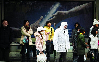 1月12日16時,市民在寒風中等公交車。未來兩日受強冷空氣影響,全省氣溫將繼續下降。