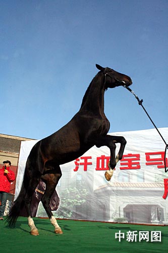 此次展出的“汗血寶馬”名叫阿利姆,是一匹“四蹄踏雪”而全身黑色的5歲公馬,身高162厘米,毛色光亮,腰身緊湊,肌肉線條優(yōu)美,堪稱良駒中的“小帥哥”。當它前蹄抬起,后蹄直立向觀眾問好時,其奔放的姿態(tài)贏來陣陣叫好聲,記者身旁的小朋友也樂得拍起巴掌。