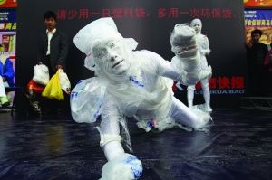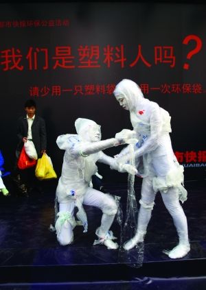 兩個被塑料袋緊緊包裹、渾身慘白的人,舉步艱難,倒在地上痛苦地掙扎;其他幾個外表正常的人,也不由自主地受到塑料袋的束縛,逐漸喪失行動能力……昨天下午,在杭州東新園沃爾瑪超市門外的廣場上,一場由本報發起、杭州環保志愿者一起參與的、以“我們是塑料人嗎”為主題的現場行為藝術,牢牢抓住了過往行人的眼球,他們圍了個里三層外三層,看清楚之后,發出這樣的驚嘆,“哦,原來是這樣的!”