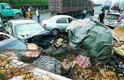 下午4點40分左右,擠成一團的車被一一拖開。救援人員開始清理路面,將土豆、碎玻璃掃到路邊。目前,事故原因還在調(diào)查中。(記者 黃智義 實習生 張葉青)