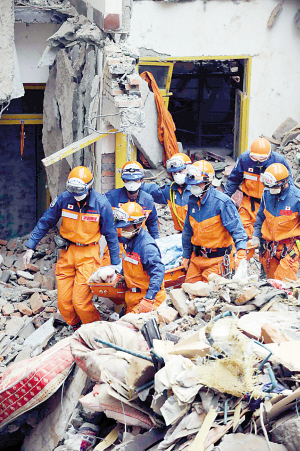昨晨(5月18日),在重災(zāi)區(qū)(四川省)綿陽市北川縣北川中學(xué)施救現(xiàn)場,多了幾十名國外救援者的身影——他們是日本國際應(yīng)急援助隊(duì)的隊(duì)員。截至昨下午1時(shí),日本救援隊(duì)已找到深埋樓底的6名學(xué)生遺體。