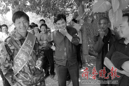 村頭的大樹上掛著“歡迎抗震救災(zāi)英雄回家”的紅色條幅,全村的父老鄉(xiāng)親都涌了出來,站在小路邊夾道歡迎,十個(gè)人一下車,鞭炮聲便響個(gè)不停。鄉(xiāng)親們摸摸這個(gè)、瞧瞧那個(gè),想看看平日里見慣了的這幾個(gè)人是不是突然長了三頭六臂。