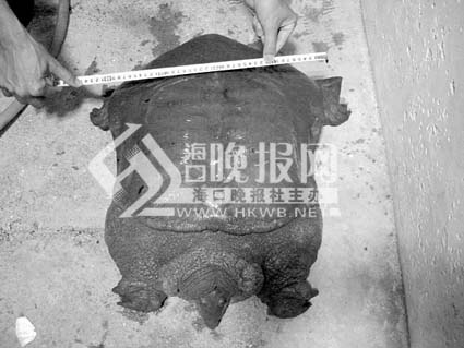 這只大甲魚是幾天前被人從尖峰嶺天池湖上釣起的,重達40斤。記者看到,這只甲魚背殼很薄,摸上去比較光滑,白色的肚皮上有花斑,顏色略白。經測量,甲魚身長約60厘米,寬約45厘米,鱉蓋如臉盆般大小。甲魚發出的聲音像牛吼一般。
