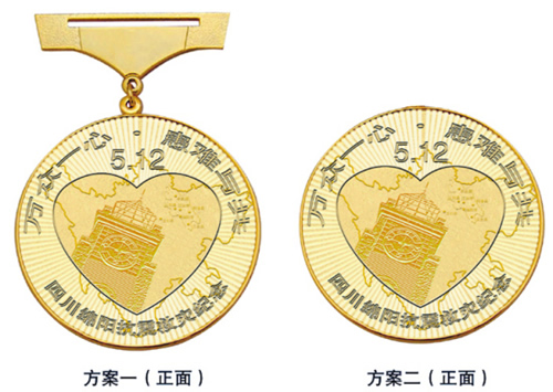 趙琛說,紀念章有著特殊的表現(xiàn)形式。內(nèi)輪廓為心型,代表全國人民萬眾一心支持綿陽賑災;外輪廓為圓形,象征太陽。整個紀念章的正面寓意為“心中太陽升起”,表達四川綿陽人民重建家園的信心和力量。