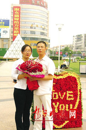 記者昨天下午趕到現(xiàn)場(chǎng)看到,“巨無霸”條幅掛在金龍大廈的東側(cè),由于地處鬧市區(qū),吸引了很多市民駐足圍觀。市民尹先生是“萬(wàn)里路”的朋友,參與了“萬(wàn)里路”特別求婚的整個(gè)“策劃”過程。他告訴記者,當(dāng)天中午1時(shí),被男友“萬(wàn)里路”約到廣場(chǎng)的“淑女貓”,無意中看到“求愛”條幅后先是一怔,剛轉(zhuǎn)過身來,男友就像變魔術(shù)一樣捧出了大把玫瑰花,并向她單膝下跪求婚,毫無思想準(zhǔn)備的女孩頓時(shí)激動(dòng)得流下了眼淚。還沉浸在幸福當(dāng)中的“淑女貓”接受記者采訪時(shí)說,她和男友是通過網(wǎng)絡(luò)認(rèn)識(shí)的,“萬(wàn)里路”“淑女貓”都是他們的網(wǎng)名,幾天前男友曾對(duì)她表示有件很重要的事情要和她說,當(dāng)時(shí)她沒有過多在意。當(dāng)天中午見到巨型條幅和999朵玫瑰花后,她感覺整個(gè)人都“蒙”了,幸福得“不知所措”、“也不知道說什么好”。