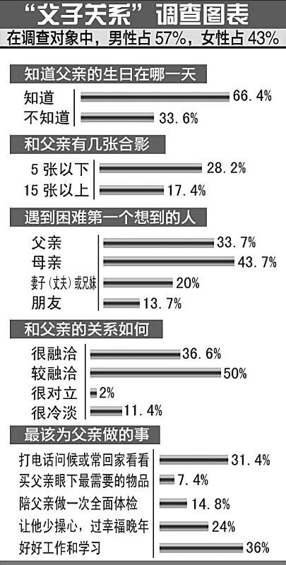 “小時(shí)候,說我的學(xué)習(xí)多一點(diǎn),長(zhǎng)大了,說我的工作多一點(diǎn),如今,工作太忙,說工作的時(shí)間也少了!”一位接受調(diào)查的男士這樣說。在接受調(diào)查的970名調(diào)查者中,有63.5%的人與父親聊天時(shí),張口先說自己。其中318名30歲至40歲年齡段的中年人中,52.6%的調(diào)查者認(rèn)為,自己和父親聊天時(shí),很多時(shí)候都是圍繞著自己的工作和學(xué)習(xí),常談及父親生活中的事情的僅占到12.3%。而在30歲以下的432名調(diào)查者中,常談及自己的工作和學(xué)習(xí)的子女,其比率高達(dá)70%。“外出上學(xué)期間,每次往家打電話,電話那頭都是母親,即使是父親接的,我也會(huì)讓他叫母親接電話,但我總能聽見他在旁邊叨叨,母親把電話給他時(shí),他總是那幾個(gè)老問題:學(xué)習(xí)好吧?身體好吧?……不到一分鐘,電話就掛了。”在省城工作剛一年的劉先生笑著說,在這一兩年內(nèi),父親跟他往一塊兒一坐,更是一開口就是工作問題。而父親的事兒,自己也很少過問,雖然記得父親的生日,但從沒給父親買過禮物。(姬仙果)