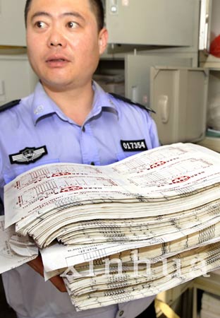 6月29日,國稅稽查隊員趙德亮正在介紹用于制造假發票的菲林片。近日,由青島市國稅稽查局、公安局聯合查辦的“4·16”特大制售假發票團伙案結案。“4·16”特大制售假發票案共搗毀假發票地下印刷工廠一個,繳獲制造假發票專業生產線一條,打掉制售假發票團伙三個,抓獲涉案人員30余人,繳獲各類假發票共計45萬余份,涉案金額120余億元,為國家避免稅款損失39.6億元。新華社記者 李紫恒 攝
