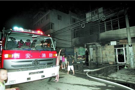 昨晚10時許,西安市邊東街瑾臻網吧突然燃起大火,大約二十分鐘后,趕到現場的消防官兵將火撲滅,但網吧外面已經燒得漆黑,整個二層小樓已經面目全非!熬W吧在一樓,二樓沒有住人。”網吧收銀員侯先生告訴民警,當時網吧內共有54個人在上網,網吧的南門被潑進了汽油,上網者都從北門逃離,沒有造成人員傷亡。
