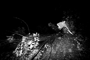 由于停電,整個土主鎮(zhèn)一片漆黑,村民們用手電筒掃攝路邊的房屋,只見一路上很多民房都成了“禿頂”,樹木東倒西歪,大部分房屋前都散落著被風(fēng)吹倒的紅磚塊,不少小路也因樹木的斷裂而無法通過。
