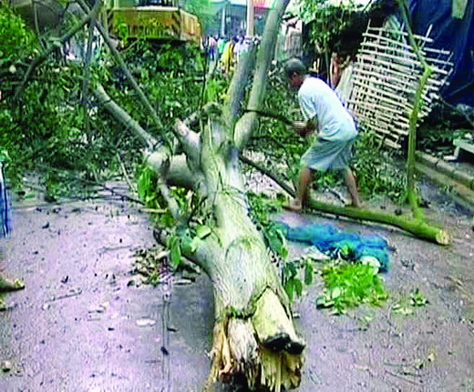 狂風突然來襲,給縣城帶來了不小的損失。數十棟房屋屋頂被掀翻,該縣最大的商業城屋頂也被掀開了一個大口子;城區數以萬計的大小廣告牌,被突如其來的狂風毀壞或卷走;數百輛停靠在街道旁的摩托車被刮倒在地;城區內許多綠化樹木,要么被攔腰折斷,要么被連根拔起。