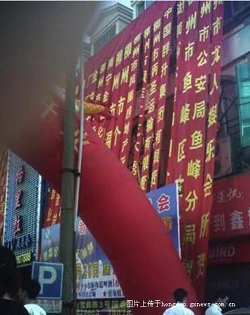 8月28日,位于柳州市文惠橋南頭的一家夜總會(huì)開業(yè)。三天后,網(wǎng)友“fox_nn:”在紅豆社區(qū)柳州論壇上發(fā)帖并配上圖片。圖片上夜總會(huì)開業(yè)的祝賀條幅,幾乎把整個(gè)樓房都蓋住了,其中最引注目的,是標(biāo)注柳州市魚峰區(qū)政府及柳州市魚峰區(qū)公安分局祝賀的條幅。