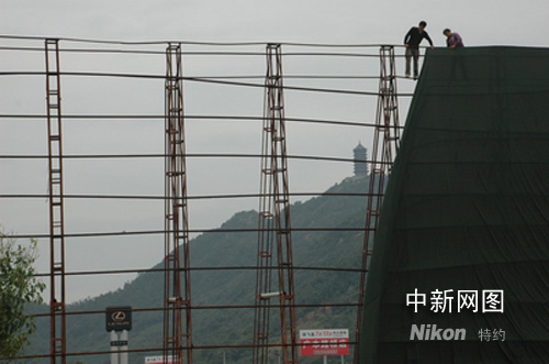 工人在浙江臺州一國慶車展現(xiàn)場加固施工,以應(yīng)對超強臺風(fēng)“薔薇”的到來。作者:陳林聰