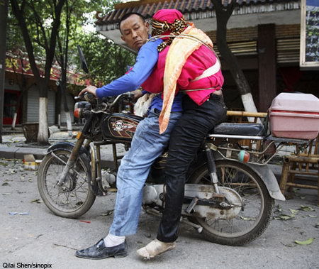 妻子雖在地震中去世,但丈夫?yàn)榱诉妻子一個(gè)尊嚴(yán),毅然將妻子綁在身上,用摩托車載回了家。這幅地震后瞬間抓拍的照片,曾感動(dòng)了萬千網(wǎng)友。昨日,建川博物館副館長(zhǎng)何新勇趕到綿竹市新龍鎮(zhèn)廣平村,從吳家方手中接過了他搭載遇難妻子遺體的摩托車。