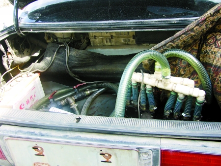 “為了避人耳目,大鐵箱被用布蓋著。鐵箱上連著直徑有5厘米粗、內(nèi)有鐵絲的硬質(zhì)塑料管,五六米長(zhǎng)的管子上安裝有閥門(mén)、連接有油泵、進(jìn)出油過(guò)濾油器、開(kāi)關(guān)等。原來(lái)轎車(chē)就是用這根‘長(zhǎng)鼻子’把大貨車(chē)的油偷走了!崩罹该髡f(shuō)。