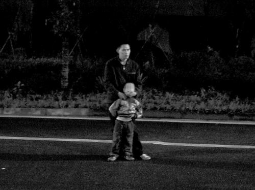 一名中等身材、瘦削的男子站在公平街辦建安社區5組路口對面的龍新路快車道上,身前緊挨著站著一名小男孩。據稱,小男孩就是持刀男子的親生兒子、5歲的小明(化名)。男子右手緊握一把20多厘米長的尖刀,刀刃緊貼著小明的脖子,不時在快車道上來回走動,還左右張望,十分警惕。一名戴眼鏡男子站在持刀男子對面三四米外,正在與當地派出所民警苦口婆心地勸說男子放開劫持的小男孩。戴眼鏡男子是持刀男子的大哥。