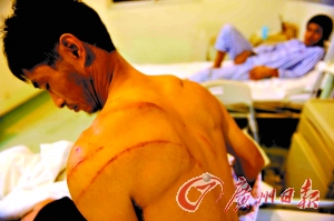 肖貴保是受傷的8人當中傷勢最重的一個,其主治醫生介紹,他面部正中一刀,刀痕從右眼正中間一直延伸到上嘴唇,后腰也被砍了一道長12厘米左右的傷口。
