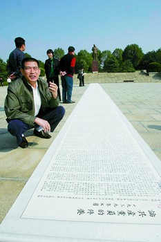 昨日上午,在劉少奇同志銅像前,李隆重將這幅書法長卷徐徐打開。“這幅作品用了11張宣紙,從標題《論共產黨員的修養》到落款,一共是1100豎行,這些數字都寓意著紀念劉少奇同志誕辰110周年。”李隆重笑著告訴來此參觀的游客。