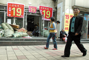 據附近一大廈保安稱,這個小店開業不到一個星期,天天掛著這樣的橫幅,門口的音響也重復放著“老板娘跑了,小老板哭了”的促銷廣告語,每天進出的顧客很多。
