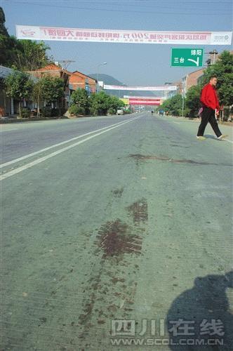 出事地點(diǎn)位于鹽亭縣兩河場鎮(zhèn)中部一個路口,是小鎮(zhèn)相對熱鬧的地段,周圍店鋪也較為集中。盡管過去了10多個小時(shí),路面上一攤凝固的血跡和往來車輛碾壓血跡形成的暗紅色輪胎印跡仍清晰可見。