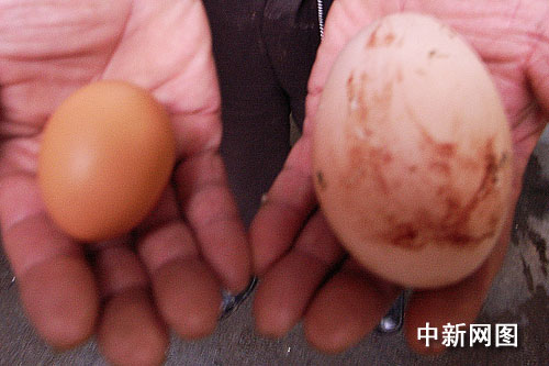 “巨無霸”雞蛋對比普通雞蛋。作者:余麗軍