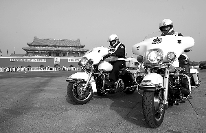 昨日上午,交警駕駛最新裝備的哈雷摩托車在天安門廣場發車開始首日執勤。記者 張濤 攝