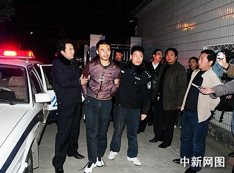 12月10日凌晨在文集鎮胡港村劫財殺人的犯罪嫌疑人黨奎,在逃往武漢轉車潛逃外地途中,被公安民警抓獲。圖為當晚7點50分,黨奎被公安民警押回到鐘祥時的情景。 攝影:趙云福