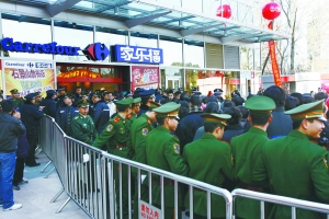 北京一家樂福開張武警護(hù)航 顧客多擠倒貨架(圖)