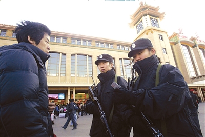 昨天,北京站女特警開始持槍巡邏。此次投入春運保衛工作的女特警共6名,分別負責北京站及西站的執勤巡邏,這也是女特警首次亮相春運。記者王儉王鵬昊攝影報道