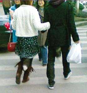 一對(duì)年輕的情侶手挽手走在大街上,兩人衣服背后竟各有一條狐貍尾巴。1月19日,有網(wǎng)友在網(wǎng)上發(fā)帖稱,自己在楊家坪直港大道遇到了身著“狐尾裝”的一對(duì)男女,并附有手機(jī)拍攝的照片。該帖發(fā)出后,引來(lái)網(wǎng)友熱議,許多80后的網(wǎng)友直呼“妖孽”,并大嘆跟不上這種怪異潮流。