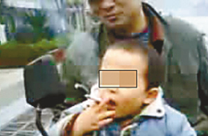 這段長達四分半鐘的視頻是一名網(wǎng)友十天前發(fā)布的,聲稱是在萬州周家壩現(xiàn)實攝錄,視頻上面一名兩三歲的小男孩坐在一輛大人的摩托車前部,在一群成年人一陣“燒起”的起哄聲中,開始表演點火抽煙。