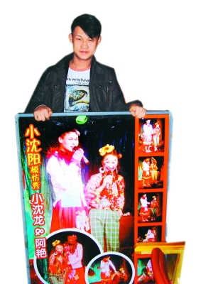 每天晚上8時11分,小沈龍都會和同伴們在金萍萍二人轉劇場開演。這幾天因為過年的緣故,小沈龍他們通常會表演到晚上11時。因為小沈陽火爆的緣故,在金萍萍二人轉劇場買票的時候,工作人員都會提醒:“我們這里有一個小沈龍,和小沈陽一樣一樣的。”在一張海報上則印著“小沈陽模仿秀——小沈龍”。