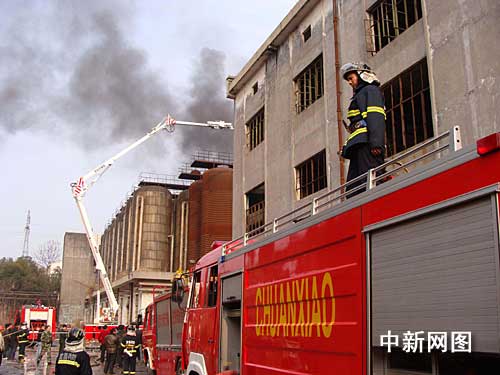 9日下午3時許記者在事發現場看到,6輛消防車停在火災現場,消防官兵正在升起云梯架起高噴槍滅火,濃濃黑煙從車間三樓冒出,緊挨著該車間內的是數十個發酵罐。隨后,記者上到車間二樓發現著火處為三樓的通風隔熱層。由于該隔熱層并沒有通道進入,消防官兵只有在外圍展開施救。
