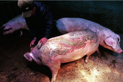 記者看到,還有9頭文身豬在寬敞明亮的豬圈中,而原來一起長大的3個同伴都準備前往歐洲,并被賣出了70萬到100萬元人民幣的高價。9頭豬都是母豬,剛滿周歲!耙驗槟肛i更耐痛,文身更方便。”飼養員潘師傅說。見到生人進到豬圈,豬開始不安分地嗷嗷叫。這幾頭豬的體重都在400斤以上,長得極為肥碩。它們身上都文有精美的圖案。“這頭文著龍紋標志的豬就叫大龍,文著美人魚的就叫美人魚,它們的名字都是根據花紋取名的!逼渌i身上文著宗教畫、中國年畫和卡通圖。