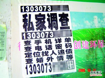 記者隨便翻開一份報紙,“覓珍調查”、“鷹鷲天下”、“貓捕調查”、“誠信偵探”之類的調查廣告屢見不鮮,上面赫然寫著“專業誠信保密,商務婚姻債務調查,特快調話單”等字樣。“這些人,實際上就是從事‘私家偵探’業務。”王志明介紹道。