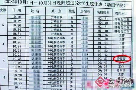 近日,北影校園內(nèi)張榜公布了各系晚歸宿舍的學(xué)生名單,有意思的是,學(xué)校竟然還把超過(guò)3次晚歸的詳細(xì)原因都公布了出來(lái)。昨天,有好事網(wǎng)友將這些名單傳到了網(wǎng)上。據(jù)記者觀察,學(xué)生們晚歸的理由五花八門,有“電視臺(tái)工作”、“吃飯”,也有“拍戲”、“回家”,而動(dòng)畫學(xué)院一位女生的理由竟然是“看星星”。“晚歸表格”一時(shí)間被無(wú)數(shù)網(wǎng)站轉(zhuǎn)載,點(diǎn)擊率一路攀升,而廣大網(wǎng)友的評(píng)論似乎也并不客氣。因?yàn)楸庇笆撬囆g(shù)院校,加上娛樂圈給人的感覺是魚龍混雜,很多人的矛頭直指藝術(shù)院校學(xué)生的素質(zhì)。