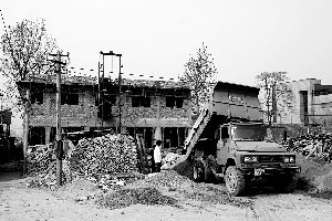 村民正在蓋兩層新房。今年2月開始,海淀區喬莊村掀起了蓋房熱。有村民直言,得知地鐵4號線延長線將通過該村后,他們建房希望能多領到拆遷補償金。記者 浦峰 攝
